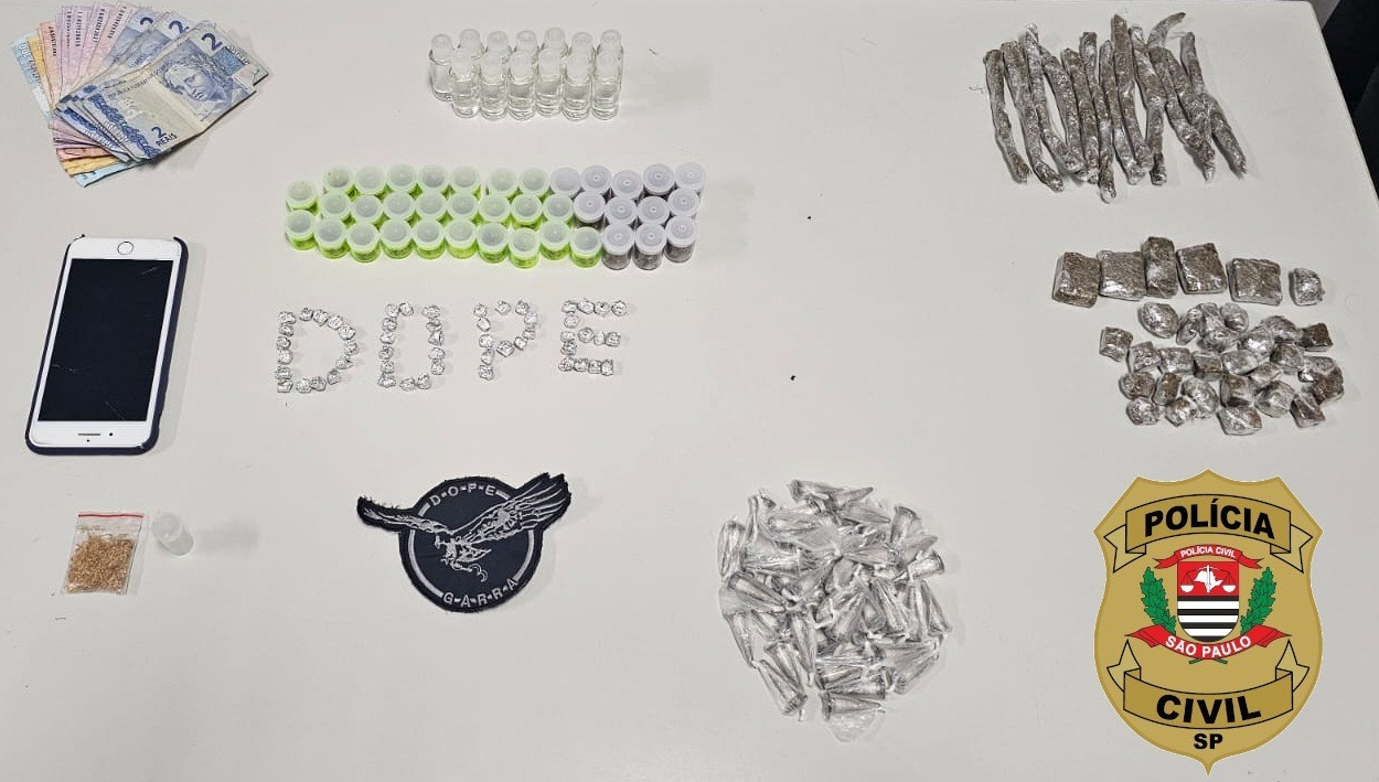 Durante o cumprimento dos mandados outro homem foi surpreendido na posse de drogas, sendo preso em flagrante por tráfico de drogas e a ocorrência está em andamento sendo registrada no DOPE.